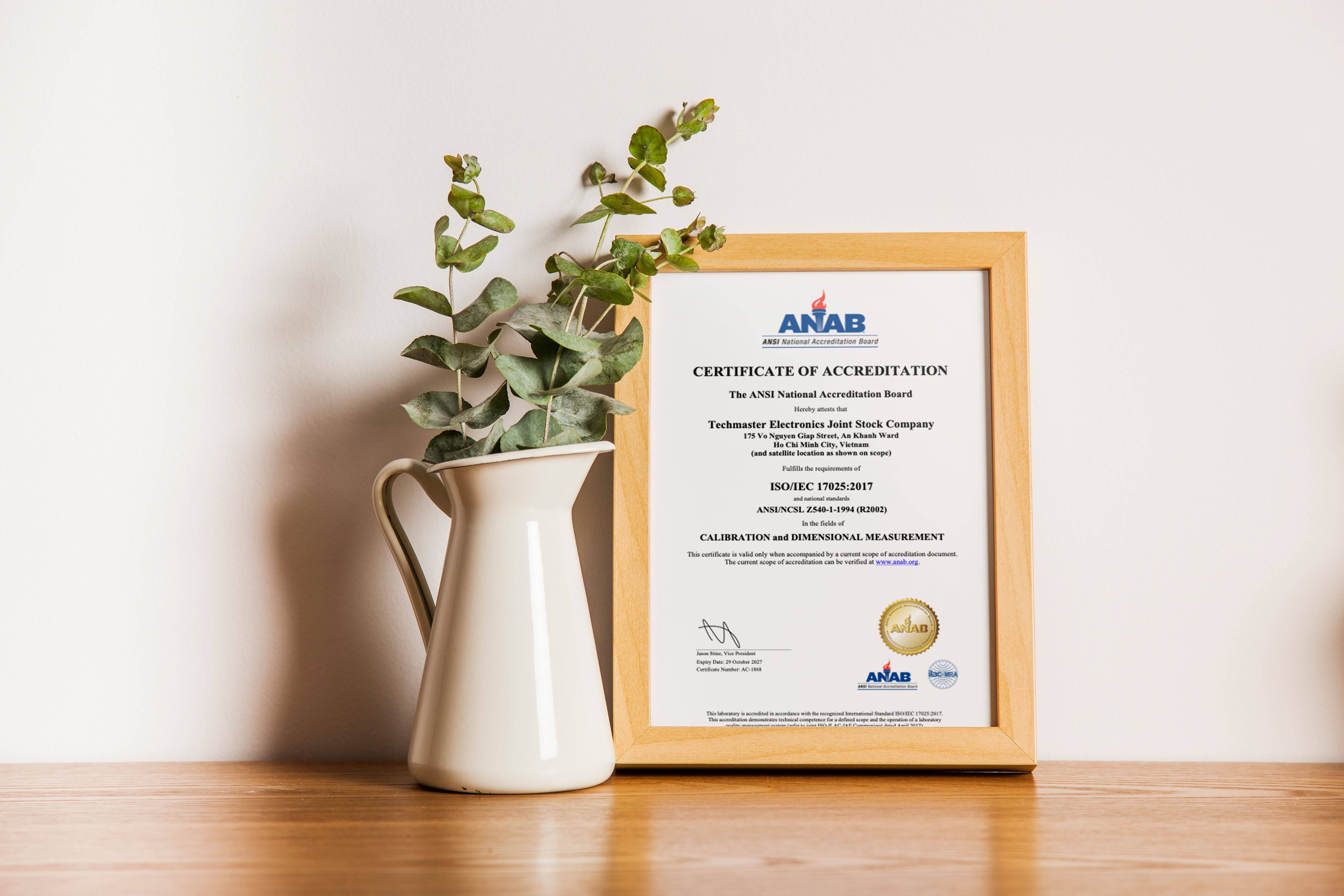 Mọi dịch vụ hiệu chuẩn tại Techmaster đều đạt chứng chỉ tiêu chuẩn quốc tế ISO/IEC 17025 được công nhận bởi tổ chức uy tín ANAB (Hoa Kỳ). Đây là minh chứng rõ ràng nhất cho năng lực kỹ thuật và cam kết về độ chính xác tuyệt đối.