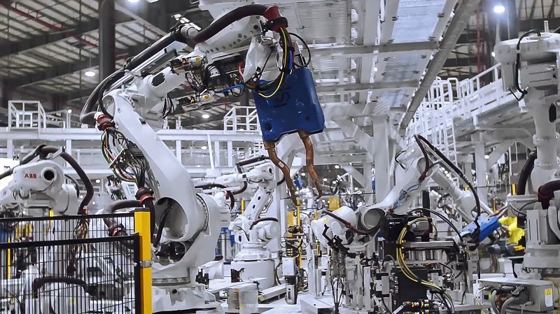 Rô bốt hàn đang làm việc trong Xưởng hàn thân xe tại Tổ hợp sản xuất ô tô Vinfast, Hải Phòng