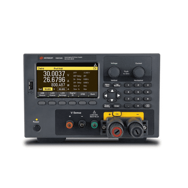 The Keysight E36154A is an 800W, 30V, 80A Autoranging Benchtop single power output DC power supply. The E36154A includes advanced characterization tools such as data logging, an optional scope view, and arbitrary waveform generation. This enables in-depth analysis and precise output modulation for power simulation applications, allowing you to accelerate development projects without compromising quality. All these features work together to provide a one-box solution that eliminates the typical requirements of multiple instruments, therefore, helping you to save time without complex setups as well as reducing your test costs.