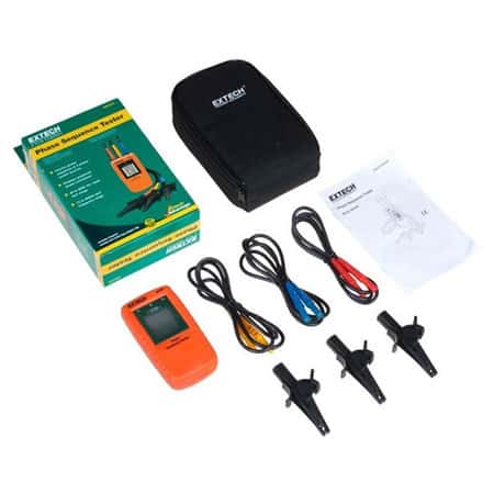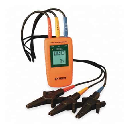 The 480400 Phase Sequence Tester has a 40 to 600-Volt rated range for testing phase orientation of 3-phase power sources over a 15 to 400Hz frequency range. Multiline graphical LCD indicates phase orientation (clockwise or counter-clockwise) and whether each of the phases is live. No battery required. Comes complete with cable, three large color coded alligator clips, and pouch case. This product is one of the first choices of engineers, maintenance technicians, … when performing phase sequence testing of motor, transmission and electrical systems. Extech 480400 owns quite compact size, fits the palm of the user. This is a handheld device with a weight of 130g and a base size of 130 x 69 x 32mm. This size helps to create flexibility for the device when using, moving and storing