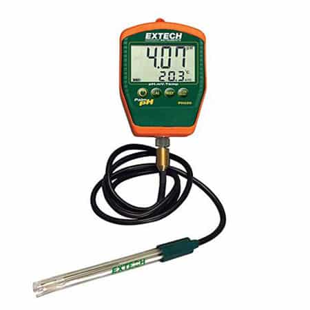 – Complete with waterproof meter, pH electrode, protective holster, pH 4 & 7 buffers (1 pouch ea.), and 9V battery