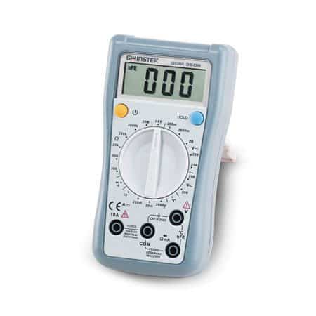 The GW Instek GDM-350B multimeter is a hand-held 3 1/2digit multimeter with an advanced design, multiple functions and reliable performance. This meter is fully capable of measuring both AC and DC voltage, DC current, resistance, temperature, the forward voltage drop of diodes, transistors, hFE and continuity tests. The multi- purpose socket is used to measure SMTs as well. This operating manual covers information on safety and precautions to fulfill CE standards. Please read the relevant information carefully and observe all the warnings and notes.