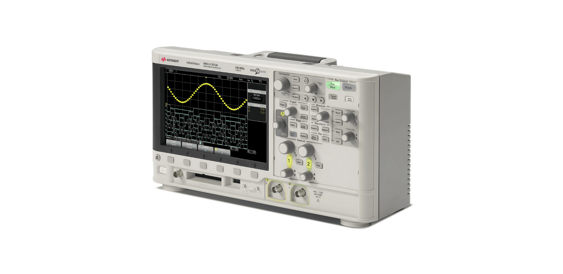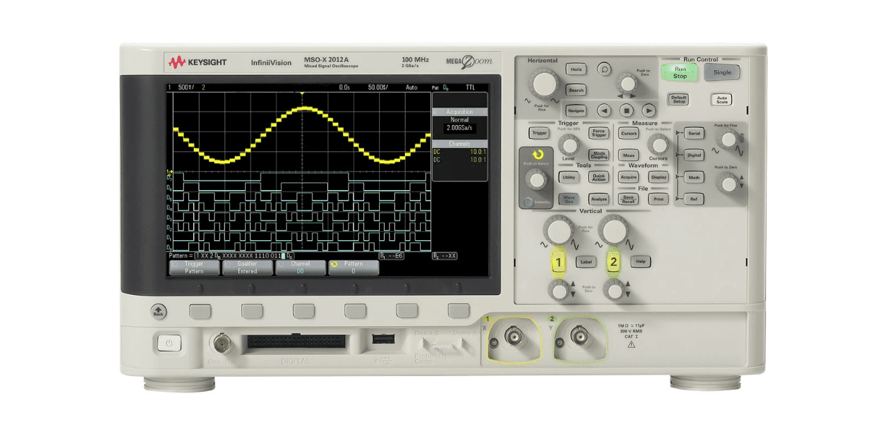 The Keysight MSOX2012A oscilloscope stands out with its sampling rate of up to 2 GSa/s and memory of 1 Mpts per channel. This enables you to capture and analyze complex signals with high accuracy and detail.