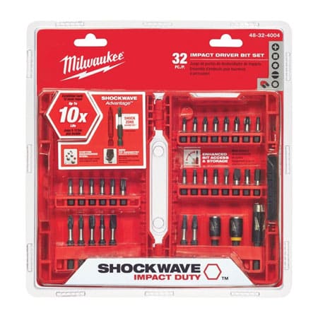 Our 32 Piece SHOCKWAVE™ Impact Driver Bit Set is engineered to be the Most Durable, best Fitting Driver Bits on the market. Each impact driver bit features Milwaukee Wear Guard Tip™ that delivers increased wear resistance which protects the fit over the life of the bit. The driver bits in this MILWAUKEE® SHOCKWAVE™ bit set has optimized Shockzones for each tip type and length of the driver bit to absorb peak torque and prevent breaking. The impact driver bits are made from Custom Alloy76™ steel, heat treated based on tip type to extend the life of driver bits, providing you with up to 50X life vs. competitive impact driver bits. Milwaukee SHOCKWAVE™ driver bits are built to deliver extreme durability for the most demanding jobsite applications.