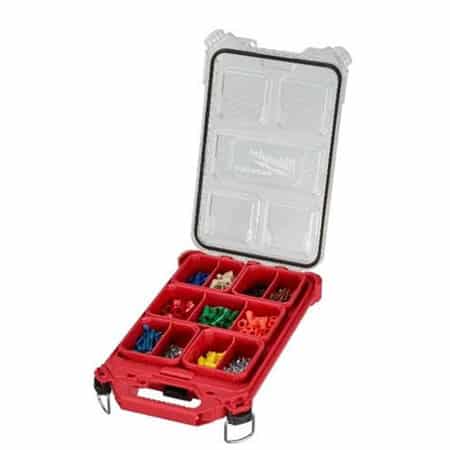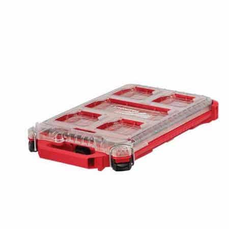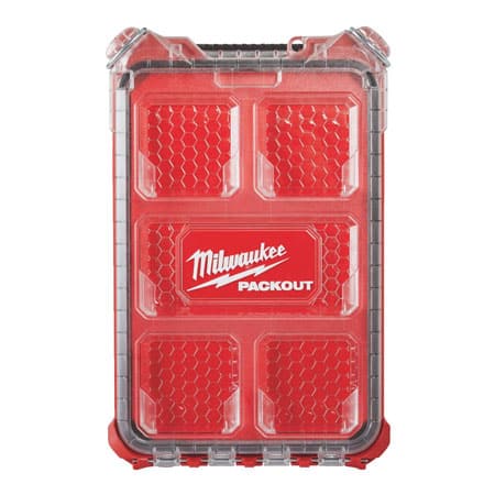 Our PACKOUT™ modular storage system is the industry’s most durable and versatile storage system. The PACKOUT™ Low-Profile Compact Organizer (Milwaukee 8436) is constructed with impact resistant materials so it can withstand harsh jobsite environments. An IP65 rated weather seal protects your tools, accessories, and small parts from rain and other jobsite debris. The small and shallow organizer’s interior features 5 removable storage bins that with removable dividers. The transparent lid of the organizer seals the bins to prevent contents from migrating and shifting during transport. Heavy duty latches and reinforced hinges ensure that the slim and compact organizer keeps the contents contained and protected. Our PACKOUT™ modular storage allows you to customize and build your own storage system to easily transport and organize your tools and accessories.