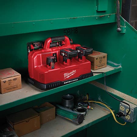 The M18™ & M12™ Rapid Charge Station (Milwaukee M12-18C3) is the fastest charging solution in the industry. With the ability to Charge 6 Packs 4X Faster, the station charges three batteries simultaneously while charging each pack up to 40% faster. The charger accepts up to (3) M18™ & (3) M12™ battery packs, reducing the amount of time spent changing out batteries and increasing productivity on the jobsite. Featuring REDLINK™ Intelligence, it communicates directly with the battery to monitor cell voltage, temperature, and charge status to optimize the performance and extend the life of the pack. The station has integrated hang holes for vertical mounting, a pass through plug to conserve outlet space, and a convenient carry handle to transport packs on and off the jobsite.