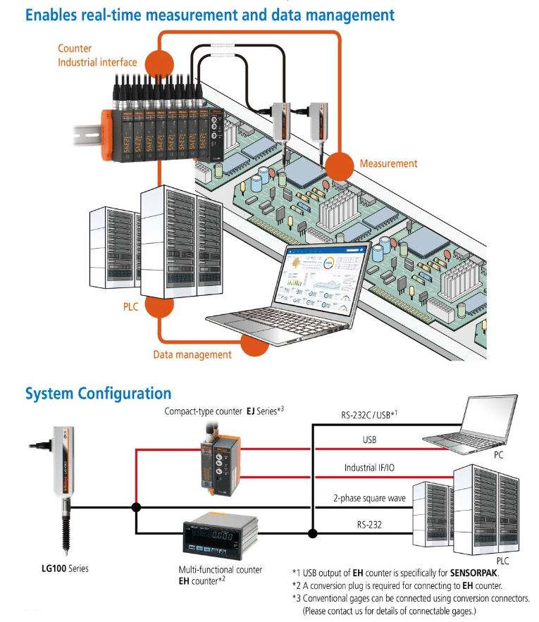 - Data can be output through an industrial interface (CC-Link) by linking a compact counter (EJ counter) with an interface unit. Constant data monitoring and positional management are performed. A USB interface is also provided for easy connection with a computer.