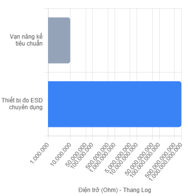 Tại sao không dùng vạn năng kế thông thường? Các máy đo chuẩn chỉ đạt ngưỡng 10 Megaohm ($10^7 \Omega$). Tiêu chuẩn ESD yêu cầu đo đến 1 Teraohm ($10^{12} \Omega$). Đó là sự khác biệt gấp 100.000 lần.