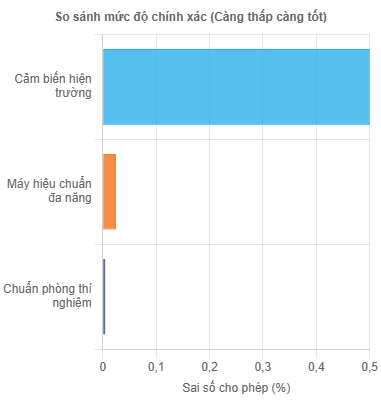 Để hiệu chuẩn một thiết bị, chuẩn phải chính xác hơn thiết bị được kiểm ít nhất 4 lần (Tỷ lệ TUR 4:1). Biểu đồ dưới đây minh họa khoảng sai số cho phép thu hẹp dần từ cảm biến trường đến chuẩn tham chiếu.