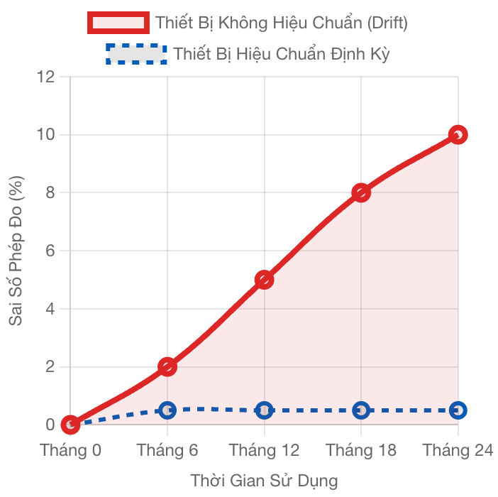 • Hậu quả: Thiết bị có thể báo cáo giá trị “chấp nhận được”. Nhưng thực tế, nó đã sai lệch $5\% – 10\%$. Điều này trực tiếp gây ra lỗi sản phẩm mà không thể phát hiện kịp thời.