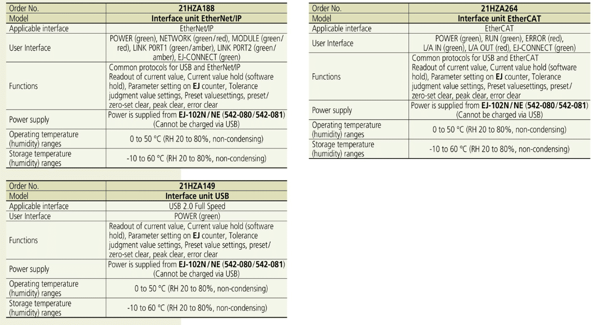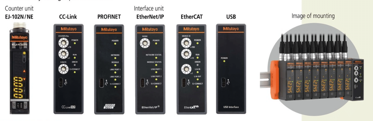 - Dữ liệu có thể được xuất ra thông qua một giao diện công nghiệp (CC-Link) bằng cách liên kết một bộ đếm nhỏ gọn (bộ đếm EJ) với một thiết bị giao diện. Dữ liệu được theo dõi liên tục và việc quản lý vị trí được thực hiện. Một giao diện USB cũng được cung cấp để dễ dàng kết nối với máy tính.