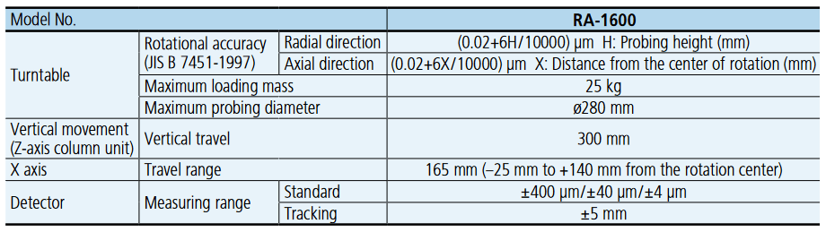 Thông số kỹ thuật Mitutoyo Roundtest RA-1600