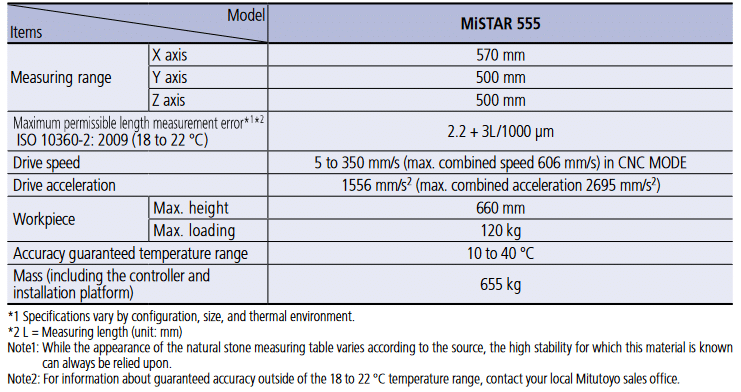 - Máy đo tọa độ 3D Mitutoyo MiSTAR 555 là dòng máy có độ chính xác được đảm bảo trong dải phạm vi nhiệt độ rộng từ 10 đến 40 oC nhờ sự kết hợp của các công nghệ như cấu trúc dẫn hướng đối xứng, vật liệu đồng nhất và bù nhiệt độ.